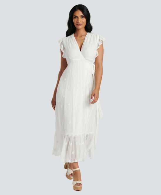 If you have an hourglass shape (wider bust and thighs with a thin waist), you might want to show off your best assets while creating balance. If you want to invest in a white dress that suits you beautifully, I recommend looking for wrap-around dresses with small draped sleeves. These kinds of dresses will emphasise your tiny waist while adding a bit of coverage to your slightly heavier bicep.